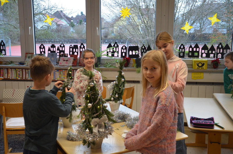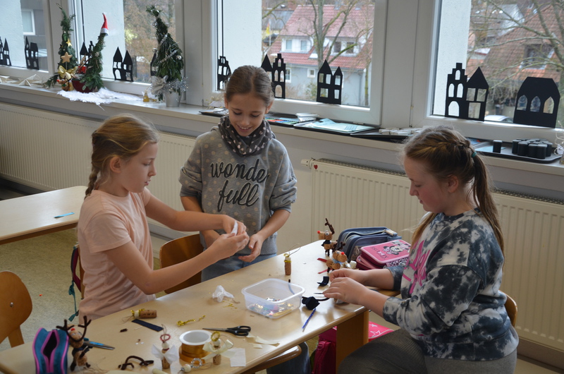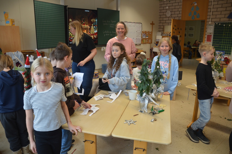 Dazu hatten sich Eltern und Lehrkräfte ein breites Bastelangebot für die Schulkinder ausgedacht. Dabei wurde bei der Auswahl verstärkt dem Nachhaltigkeitsgedanken Rechnung getragen. Aus insgesamt 11 Workshops angefangen über Holzarbeiten, Gestecken, Christbaumaufhängern aus Papier oder Naturmaterialien, Geschenktüten, und vieles mehr durfte jedes Kind zwei Workshops aussuchen. Nach der Verteilung wurde in nahezu jeder Ecke des Schulhauses in kleinen, klassenübergreifenden Gruppen geschnitten, gefaltet, gemalt, Holz geschliffen, verziert und geklebt, so dass sich am Ende jedes Kind über gelungene Dekorationen freuen durfte. Die Arbeiten werden während der öffentlichen Weihnachtsfeier am 12.12.24 in den Klassenzimmern präsentiert.